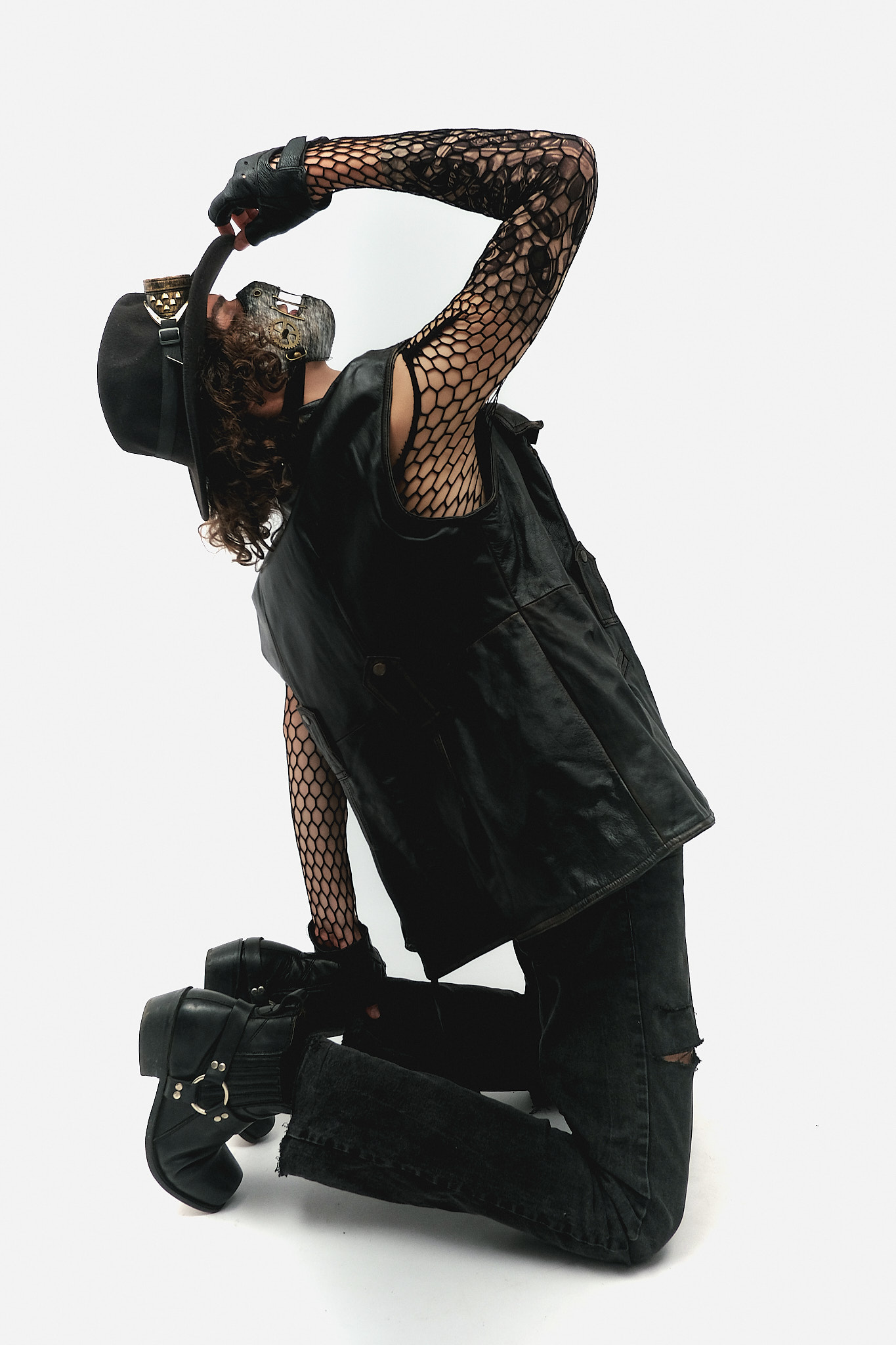 Брутальний та агресивний образ у стилі постапокаліптичного стімпанку. Лук поєднує в собі естетику «Божевільного Макса» з класичними атрибутами механізованої епохи. Використання грубої шкіри, металевих елементів та сітки створює вигляд небезпечного мандрівника пустель, де панують панк-рок та індустріальний хаос. Образ транслює силу, таємничість та готовність до виживання у суворому світі майбутнього.