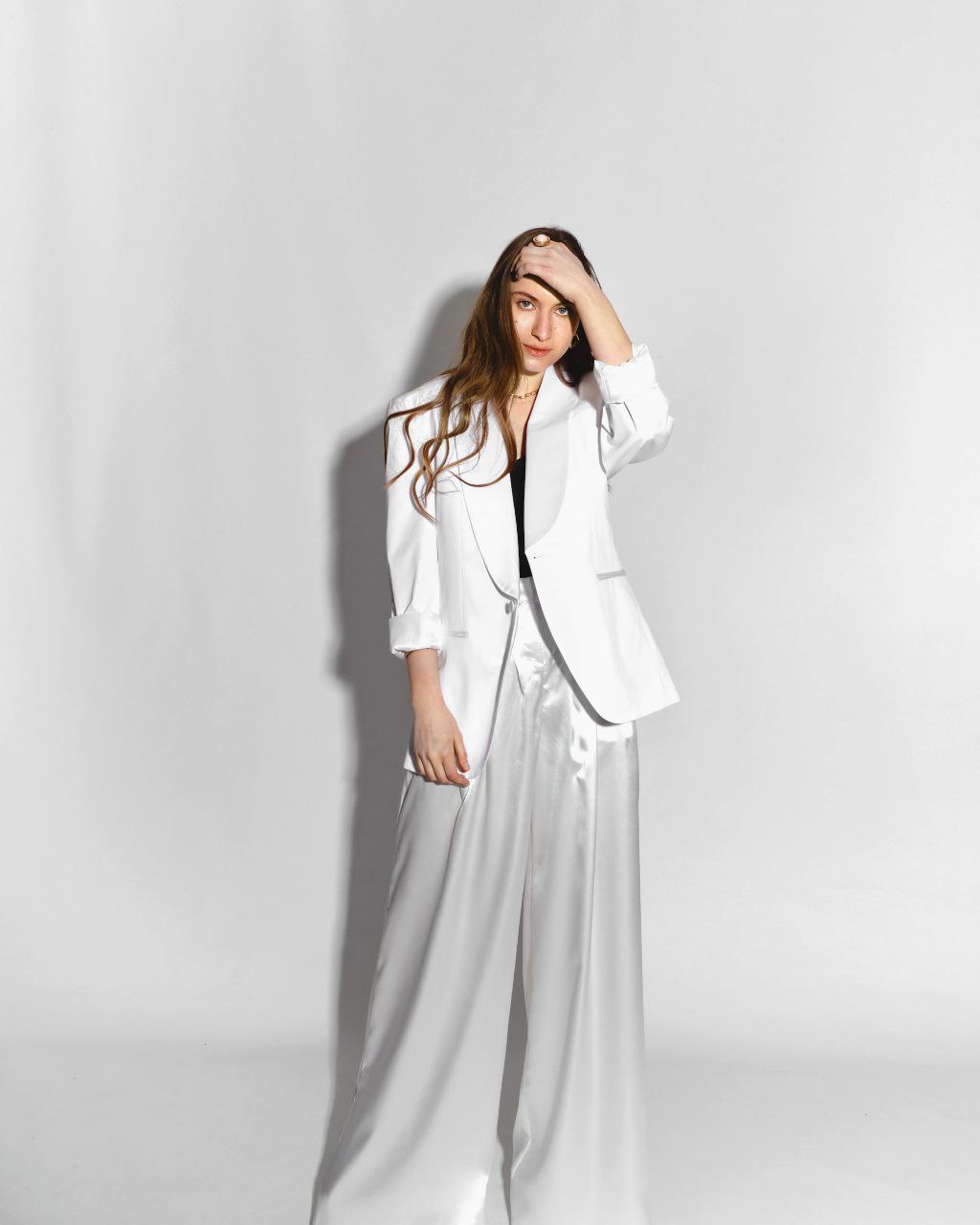 Втілення сучасної жіночої сили через деконструкцію класичного чоловічого гардероба. Образ базується на контрасті структур: строгий тейлорінг жакета зустрічається з розслабленою плинністю атласу. Це "power dressing" нового покоління, де білий колір виступає символом чистоти намірів та безкомпромісного стилю. Лук створений для зйомок у стилі мінімалістичного глянцю, де важливі грані між маскулінністю та тендітністю, а світло підкреслює глянцевий відблиск тканини.