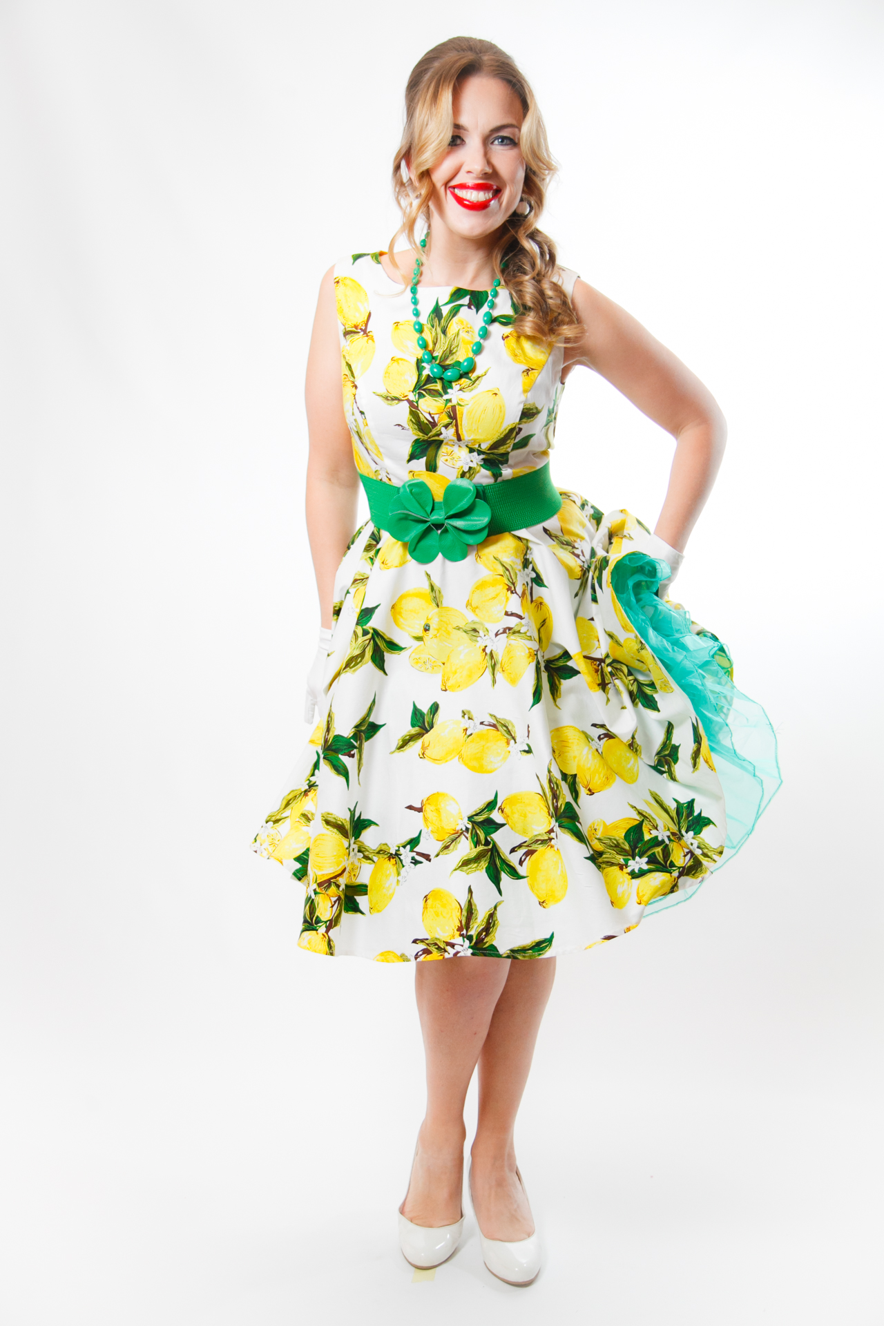 Сукня: Біла сукня силуету "A-line" без рукавів, прикрашена великим реалістичним принтом лимонів та зеленого листя. Пишна спідниця доповнена смарагдовим фатиновим під'юбником, що створює кокетливий об'єм.